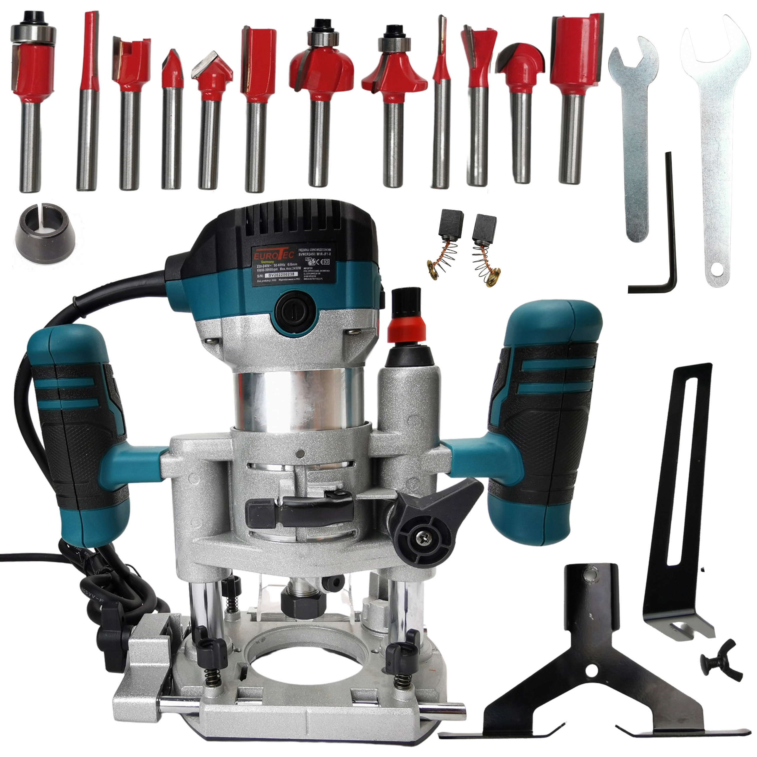 ✅Urządzenie wyposażono w bardzo mocny silnik o mocy 2450 W. Regulowane obroty w zakresie 10000 do 30000 obrotów/min pozwalają na dobranie odpowiedniej prędkości dla obrabianego materiału. W zestawie tuleje redukcyjne, dzięki czemu możemy stosować frezy 8mm i 6mm